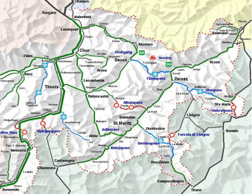 rechts talaufwärts, durch Zernez (Einkaufsmöglichkeiten) Richtung St.Moritz,